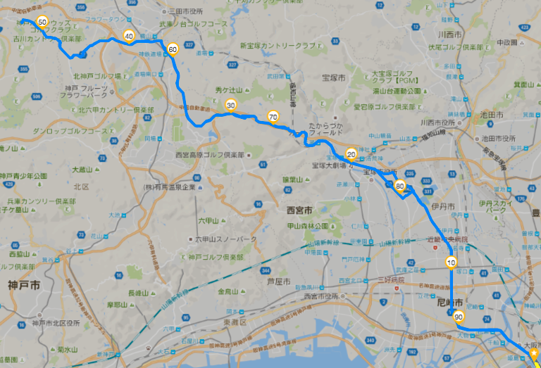 宝塚を越えたあたりで42号線->335号線->142号線で尼崎方面へ向かいます。