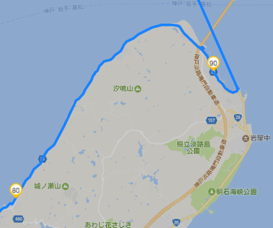 淡路島のみの距離はおよそ90kmで走行時間は4時間30分ぐらいです。