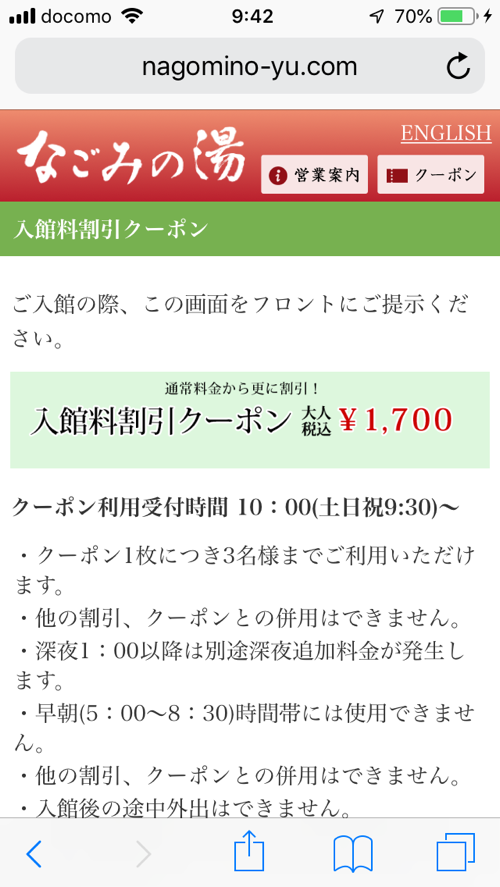 10時から1時まで、最大15時間滞在で、定価1,800円で公式サイトのクーポンで1,700円でした。